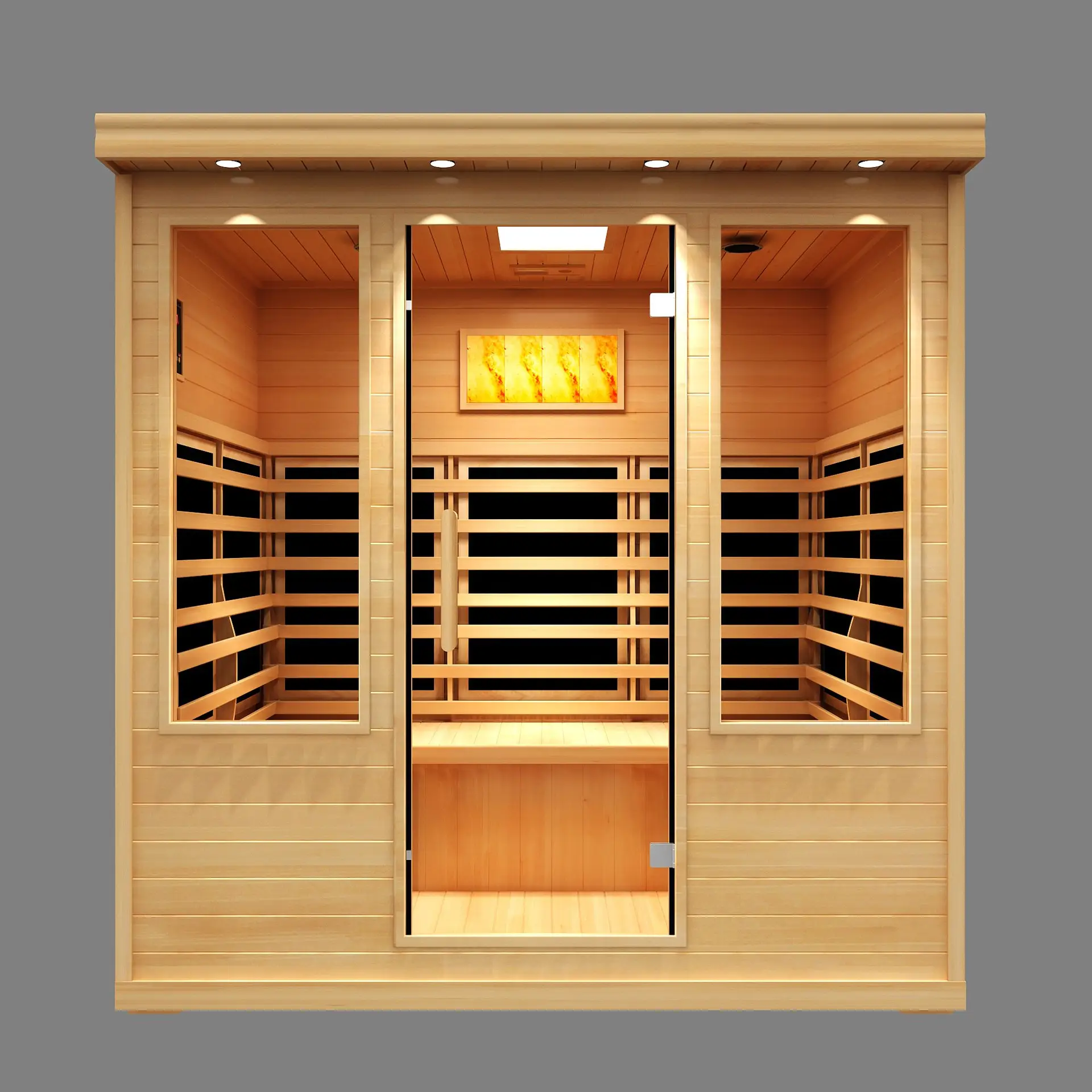 5. Heater Panels and Rods: Guaranteeing the warmth and efficiency of your sauna’s heating elements in this family size salt cabin with heat. Covered.